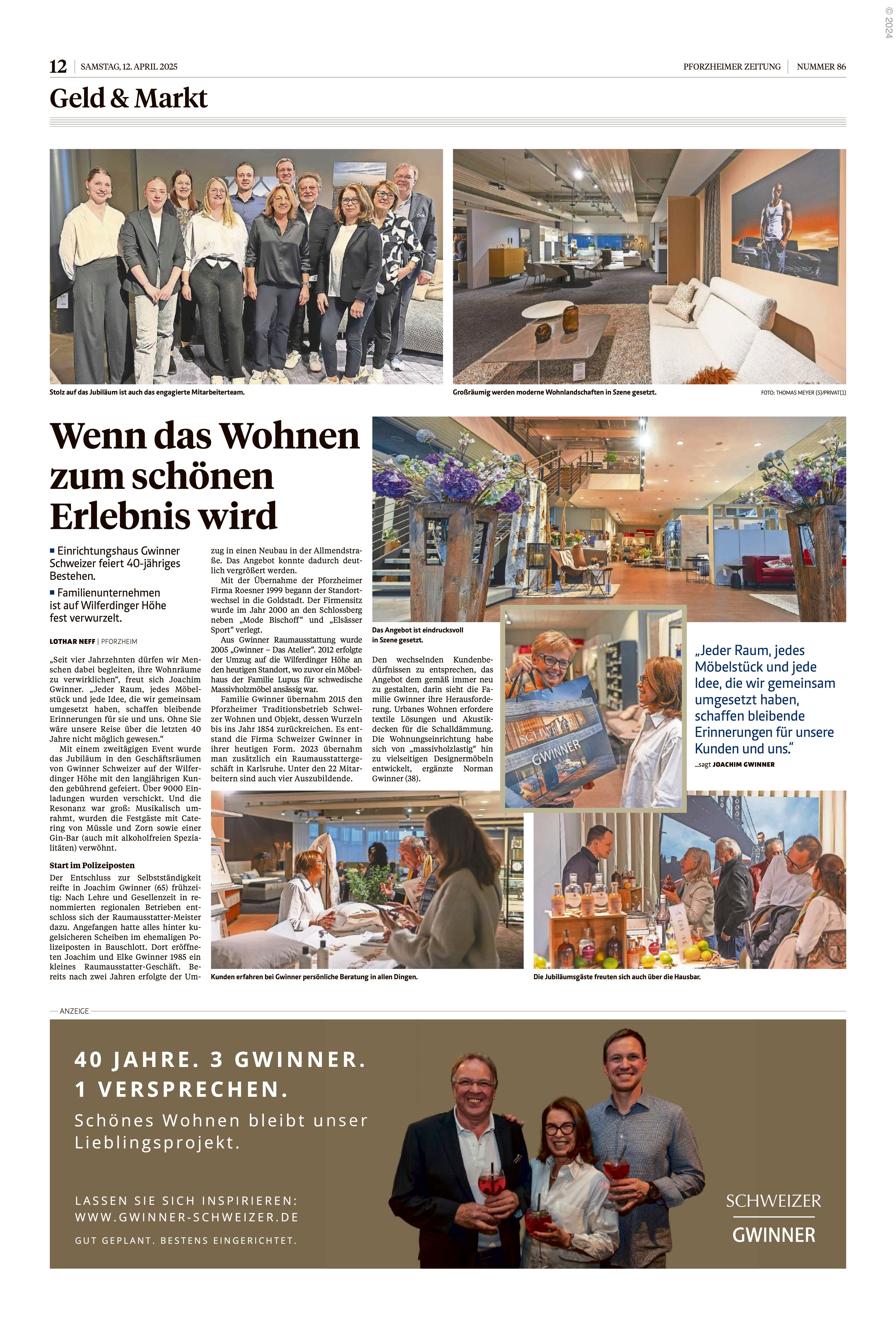 „Seit vier Jahrzehnten dürfen wir Menschen dabei begleiten, ihre Wohnräume zu verwirklichen“, sagte Joachim Gwinner in der Pforzheimer Zeitung. „Jeder Raum, jedes Möbelstück und jede Idee, die wir gemeinsam umgesetzt haben, schaffen bleibende Erinnerungen für sie und uns.“